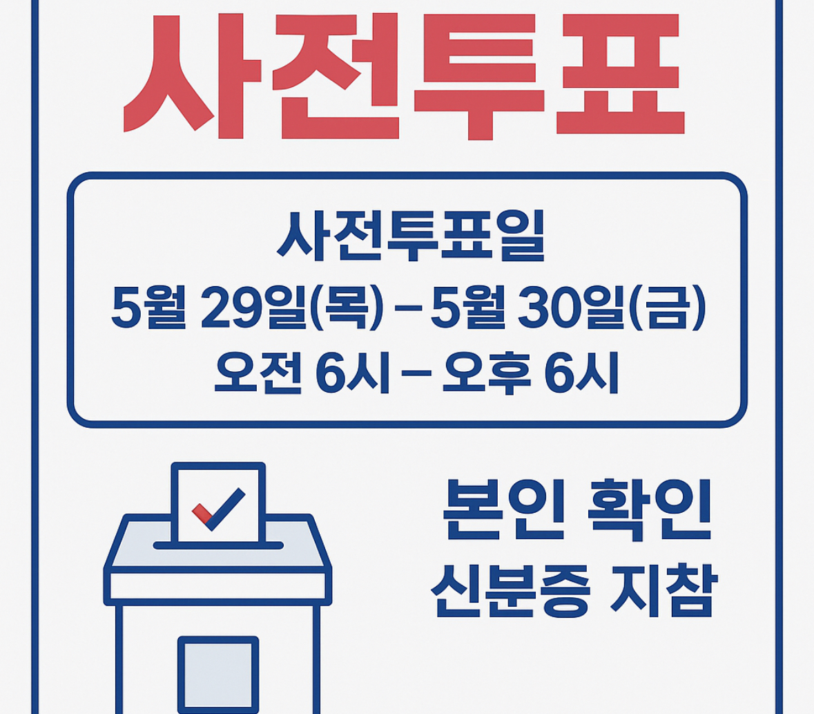 2025년 6월 3일(화)은 제21대 대통령선거일입니다. 그러나 바쁜 일정이나 예상치 못한 일로 인해 본투표 당일에 투표소를 찾기 어려운 분들도 계실 텐데요. 이런 경우를 위해 준비된 제도가 바로 사전투표제도입니다.사전투표는 별도의 신청 없이도 전국 어디서나 참여할 수 있어 매우 편리하며, 실제로 많은 국민이 사전투표를 통해 소중한 한 표를 행사하고 있습니다. 이번 글에서는 사전투표 기간, 방법, 준비물, 유의사항까지 한눈에 보기 좋게 정리해드릴게요.⸻✅ 제21대 대통령선거 일정 한눈에 보기 • 사전투표일 : 2025년 5월 29일(목) ~ 5월 30일(금) • 사전투표 시간 : 매일 오전 6시 ~ 오후 6시 • 본투표일 : 2025년 6월 3일(화) • 본투표 시간 : 오전 6시 ~ 오후 8시사전투표는..