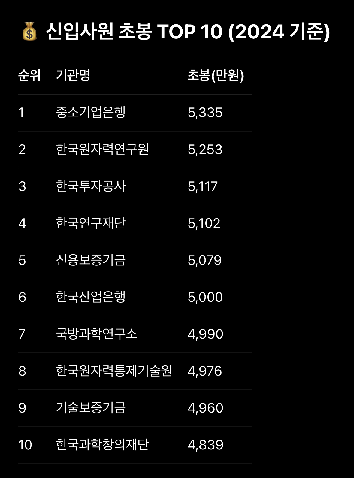 💰 신입사원 초봉 TOP 10 (2024 기준)